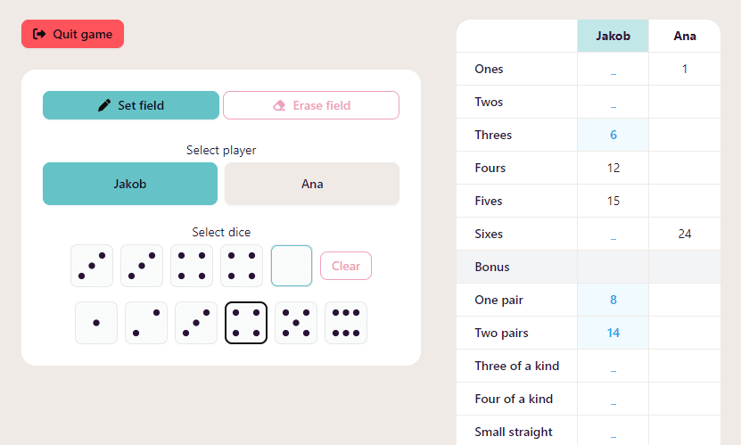 Firstly written in Flutter, later rewritten in Next.js and finally rewritten in SvelteKit, this project is a simple Yatzy scorecard.